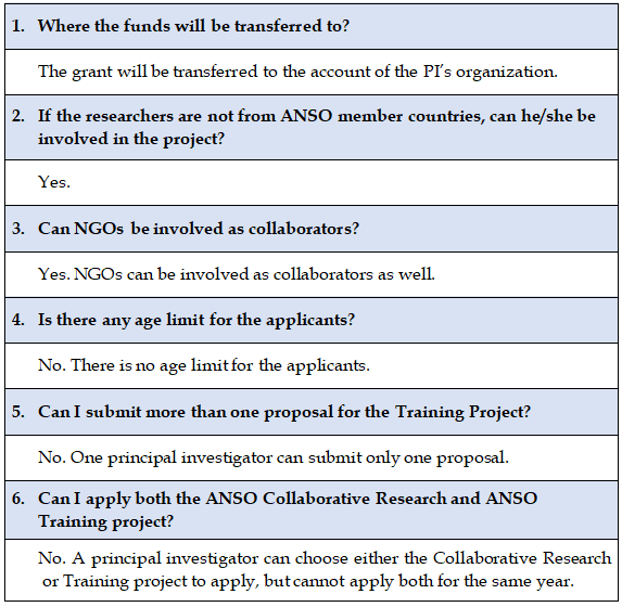 1) Only researchers from ANSO member organizations (see Attachment 2 for reference) are eligible to apply for the Training Project as a Principal Investigator (PI).