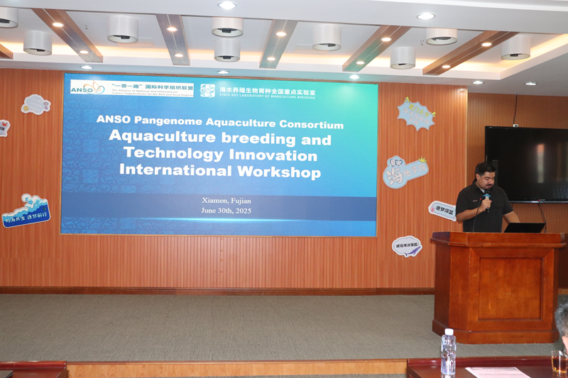 On June 30, the Aquaculture Breeding and Technology Innovation International Workshop of the Pangenome Aquaculture Consortium (PAC) within the Alliance of International Science Organizations (ANSO) was held successfully at Xiamen University. Co-hosted by the PAC and the State Key Laboratory of Mariculture Breeding, the workshop aimed to strengthen international collaboration under the ANSO Aquatic Pangenome Aquaculture Consortium (PAC) while advancing aquatic genomic resource development and breeding technology innovation. Over 30 scholars from esteemed institutions such as the University of Chile, Beijing Academy of Agricultural and Forestry Sciences, Ocean University of China, Chinese Academy of Fishery Sciences, and Xiamen University participated in the event.