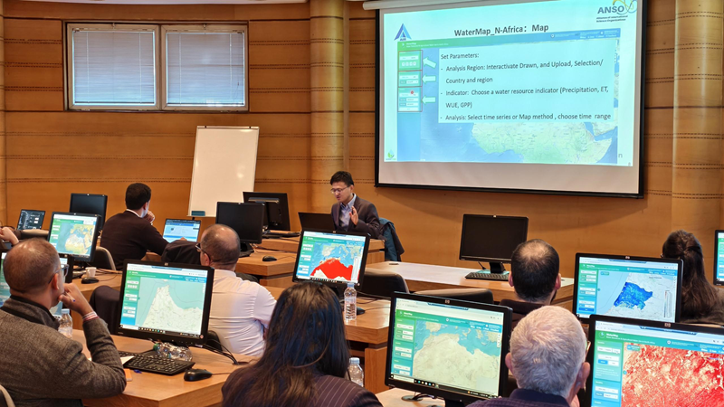 培训期间,空天院研究员贾立介绍了ANSO联合项目的整体框架与目标,副研究员郑超磊、蒋敏博士等专家团队系统讲授了遥感蒸散发监测、农田需水耗水估算、农业生产力评估、用水效率评估等核心技术,并重点推介了团队自主研发的ETMonitor遥感蒸散发模型,以及基于卫星观测与云平台技术构建的“北非农业水资源和水分利用监测平台(WaterMap N-Africa)”。