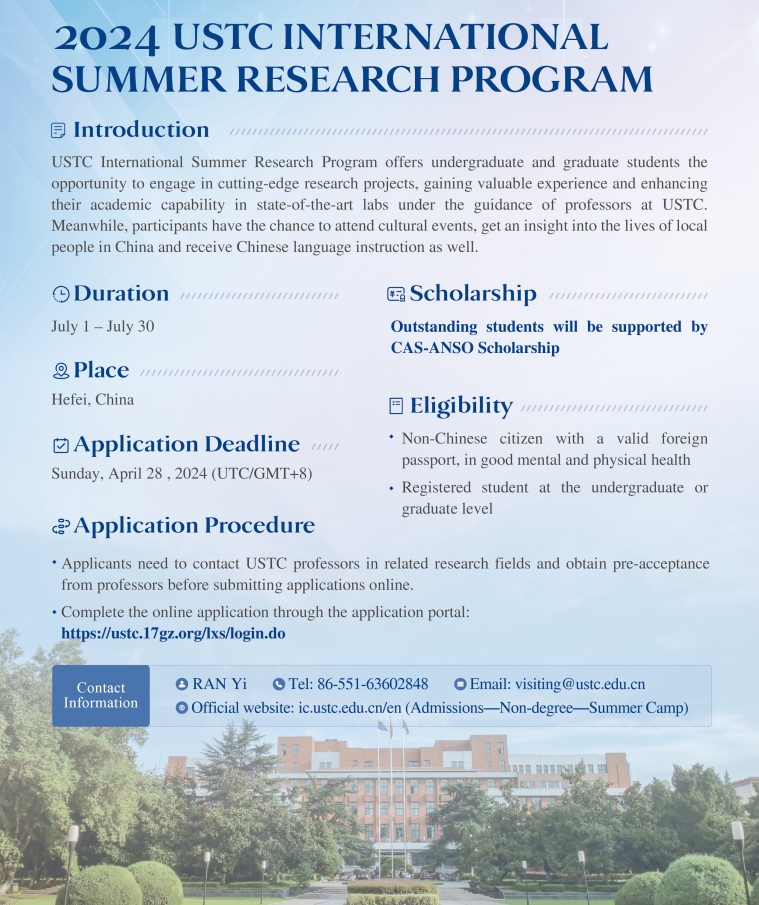 In 2024, two summer school programs sponsored by the CAS-ANSO Scholarship are now open for applications. These programs will be organized by USTC and UCAS respectively. For more detailed information regarding the programs, interested individuals are encouraged to visit the universities’ official websites. Contact information for further inquiries is provided below.