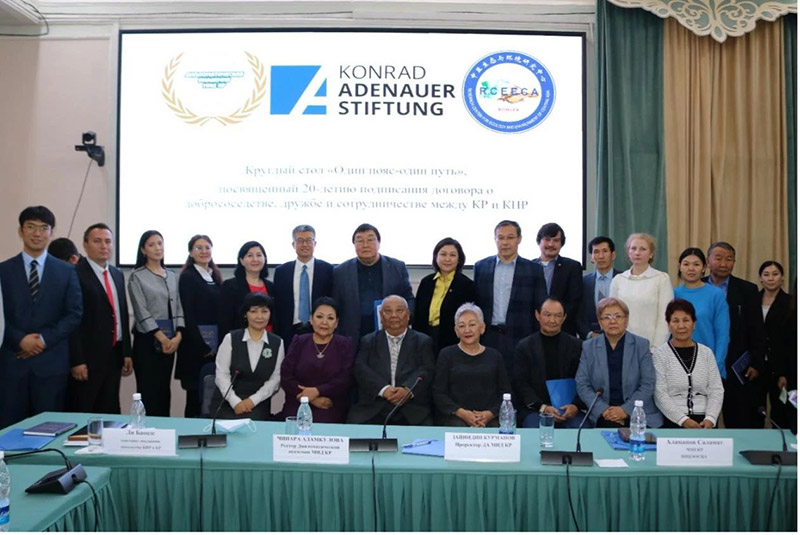 “一带一路” 圆桌研讨会举行是为纪念吉尔吉斯斯坦(简称“吉国”)与中国睦邻友好合作条约签署20周年,由吉尔吉斯斯坦外交部发起,吉尔吉斯外交学院、康拉德-阿登纳基金会和中亚生态与环境研究中心(比什凯克)联合承办的。吉尔吉斯斯坦议会国际事务、国防、安全和移民事务委员会副主席M.特米尔巴耶娃,吉尔吉斯国家科学院院长M.朱马塔耶夫,吉尔吉斯饮用供排水管理局局长K.朱马利耶娃等出席研讨会。
