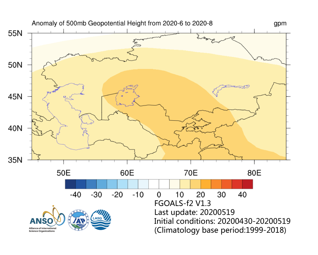 中科院大气所的“FGOALS-f2季节内-季节预测系统”为ANSO MISSPAD项目的核心预测系统。根据2020年5月更新的季节预报,2020年夏季(6、7、8月),中亚地区降水偏多,偏多区域主要在乌兹别克斯坦和土库曼斯坦中东部、吉尔吉斯斯坦和塔吉克斯坦西部,以及哈萨克斯坦南部地区,这一区域降水距平百分率达到90%以上,属于异常偏多。预测降水主要出现在7月和8月。