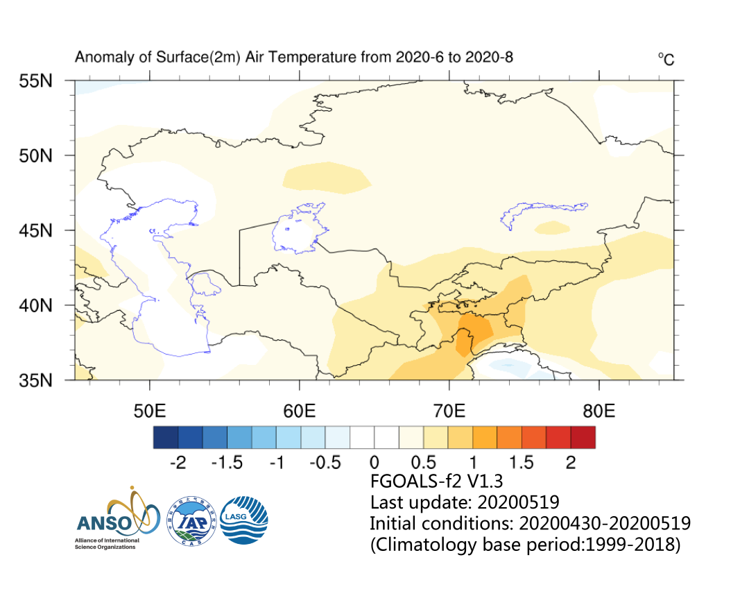 图3. “FGOALS-f2季节内-季节预测系统”预测的2020年夏季中亚地区的温度距平(℃)
