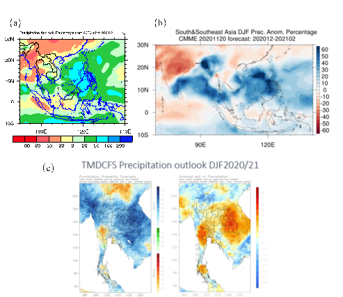 2020年11月ANSO-MISSPAD项目团队结合中国科学院大气物理研究所FGOALS-f2 无缝隙预测系统,中国气象局CMME预测系统以及泰国气象局动力-统计降尺度TMDCFS系统的最新季节联合预测表明,受拉尼娜的影响,东南亚海洋大陆南部和菲律宾群岛部分地区对流降水增强,泰国北部地区降水略偏多,而中南部降水较往年减少。2020年12-2021年2月中南半岛大部分地区气温偏低0.5-1.5℃以上,而海洋性大陆大部分地区平均气温较常年略微偏高。