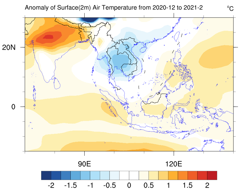 图2. “FGOALS-f2季节内-季节预测系统”预测的2020-2021年北半球冬季(12-2月)东南亚地区的温度距平(℃)
