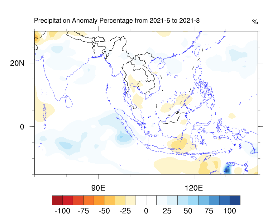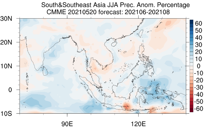 根据2021年5月更新的中科院大气所FGOALS-f2_v1.3预测系统和国家气候中心中国多模式集合预测系统(CMME),2021年夏季(6-8月),东南亚地区降水在海洋性大陆偏多,偏多区域主要集中在印度尼西亚,特别是海洋性大陆地区,降水距平百分率部分超过50%。然而,中南半岛地区降水变化不是非常明显,发生持续性强降水概率较低,但不排除次季节尺度上台风活动造成的短暂极端暴雨事件发生。