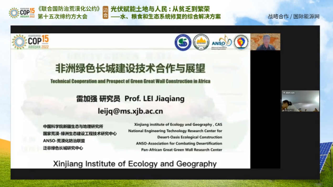 联合国防治荒漠化公约组织(UNCCD)第十五届缔约方大会于2022年5月9-20日在科特纳瓦的阿比让举行。5月16日,由UNCCD秘书处与清华大学共同主办的题为“光伏赋能土地与人民:从贫乏到繁荣——水、食物和生态系统修复的综合解决方案”的边会通过线上线下相结合的形式召开。ANSO荒漠化防治联盟组织科研人员线上参会,雷加强研究员受邀做主题报告。