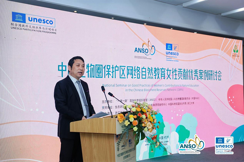 4月20日—23日,在联合国教科文组织(UNESCO)参与计划(Participation Programme)项目的支持下,由“一带一路”国际科学组织联盟(ANSO)和中国人与生物圈国家委员会(中国MAB)联合主办的“中国生物圈保护区网络(CBRN)自然教育女性贡献优秀案例研讨会”在浙江杭州举办。该研讨会由浙江天目山国家级自然保护区管理局承办,旨在向世界展示女性在中国生物圈保护区网络自然教育领域的突出贡献,搭建经验交流与思想碰撞的平台,助力即将在中国杭州召开的第五届世界生物圈保护区大会。会议得到了生态环境部宣传教育中心、国家林业和草原局宣传中心、中国科学院国际合作局、浙江大学的支持。ANSO秘书处副主任易志军主持开幕式,来自全国的80多名嘉宾、专家及优秀案例代表参会。