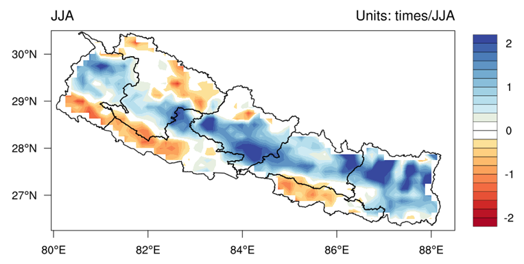 According to the latest forecast released by the FGOALS-f2 seamless prediction system of the Institute of Atmospheric Physics, Chinese Academy of Sciences, most areas across the hilly regions of Nepal, including large mountainous areas of Central and Eastern Nepal, will receive more precipitation than usual this summer (2023, JJA), which may lead to higher chances of landslides and flash flood in the country. However, the southern part and western High-Mountain region will be experiencing less precipitation, which may impact the paddy production this year in the southern part and risk of drought in west Nepal (Figure 1). Moreover, extreme precipitation events will occur across most parts of Nepal, with higher frequency over some areas of central, eastern, and western Nepal, which may lead to flash floods (Figure 2).